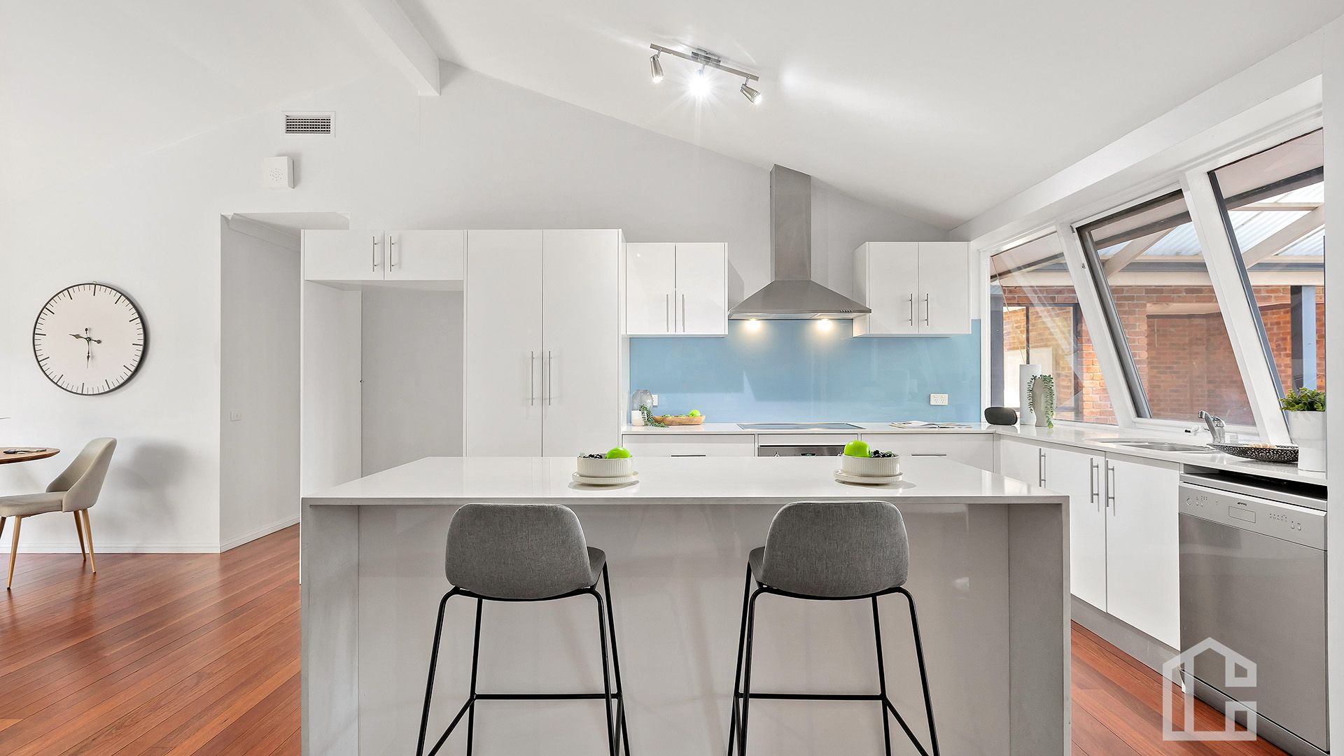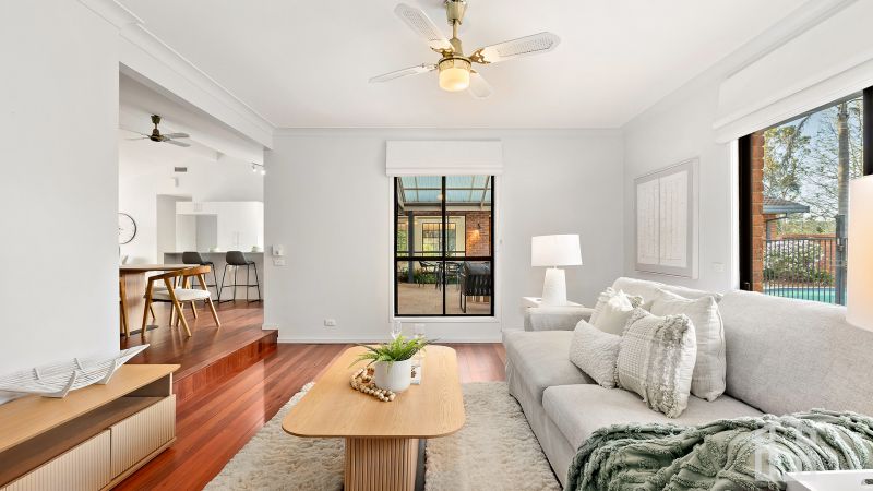 FEATURES: Entertainer's kitchen with stone waterfall island, Smeg appliances and ample storage; cathedral and tall ceilings, bay windows and polished redgum timber floors; ducted and split-system air conditioning, ceiling fans and gas bayonet; freshly painted interiors and new carpet throughout; large laundry with external access and excellent storage, including under stair; expansive covered alfresco entertaining area overlooking the pool; sparkling inground pool, level yard and established gardens; double garage plus circular driveway providing ample off-street parking.